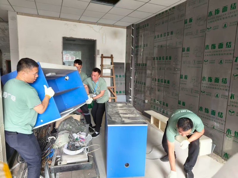 党员干部始终挺在一线:于洪区域公司全体党员干部吹响这场攻坚战的集结号,带领全体党员冲锋在前。他们牵头组建拆改团队,肩扛手搬装修材料,保障日常运营与改造同步推进;曾担任驻村第一书记的史艳清,将坚韧奉献的驻村精神带回团队,与主管刘珣共同提出“把营业厅当成‘家’来建”的口号,还带头放弃休息时间,亲自动手参与营业厅拆改。全体员工心往一处想、劲往一处使:为节省开支,大家从公司内部及停用营业厅搜集闲置建材,甄选可复用旧件,让老设备焕发新生——旧门头覆盖原营业厅名称,贴上“长江北街营业厅”字样,便成了新门头;从铁西二区域公司“退役”的营业板台,经打磨后再度“上岗”;唯一一台空调来自原机房拆机;废弃玻璃板被改造成明亮隔断;机房门框由三种不同材料拼合而成;没有专业施工队伍,就自己调漆刷墙、更换窗户;营业厅地砖“东拼西凑”,色差明显处便铺地毯遮盖;吊顶则是从其他废弃机房拆下后自行拼装;为避免隔壁浴池潮气导致墙面“长毛”,就用铝扣板替代处理……营业厅的每一处细节,都写满团队修旧利废的巧思与亲手打造的痕迹。