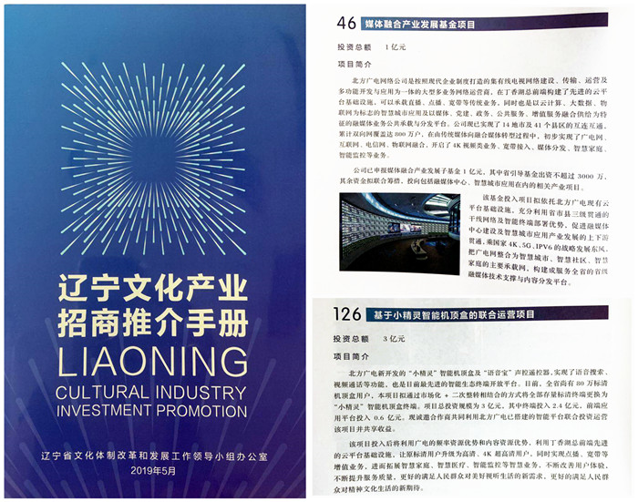 在同日举办的项目对接洽谈会上,北方广电网络公司共推出了两个文化产业招商项目,即拟联合筹措1亿元资金,用以建立媒体融合产业发展基金项目,基金支持具体包括融媒体中心、智慧城市应用在内的相关产业项目。并拟筹资3亿元资金,针对辽宁省尚存的80万标清机顶盒用户,通过市场化+二次整转相结合的方式将全部存量标清终端更换为“小精灵”智能机顶盒终端,其中终端投入2.4亿元,前端应用平台投入0.6亿元。上述两个项目,诚邀合作商共同利用北方广电已搭建的智能平台联合投资运营并共享收益。