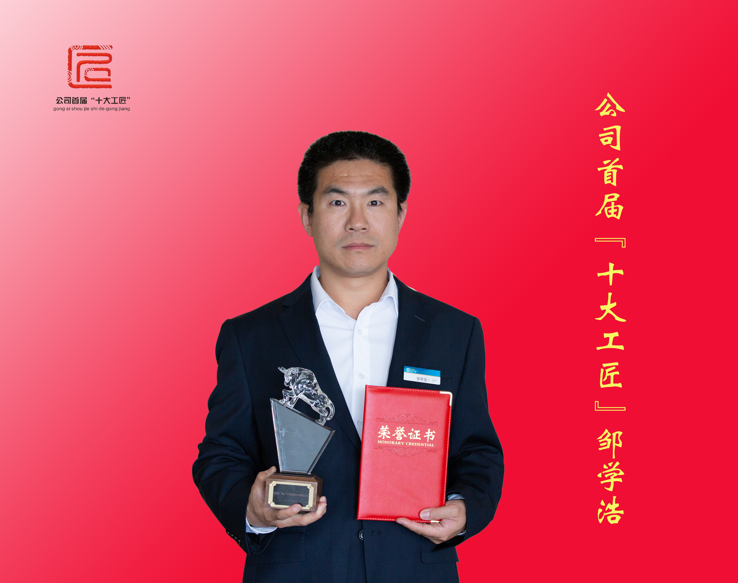 邹学浩,公司新业务中心网络组组长,高级工程师,是冲锋在网络维护一线上的共产党员,是公司数据核心网维护带头人。从事网络维护工作20年来,他勤于钻研,精益求精,秉承工匠精神,在平凡的技术维护岗位上,创造了非凡的工作业绩,让青春在平凡的岗位上闪出耀眼的光芒。
