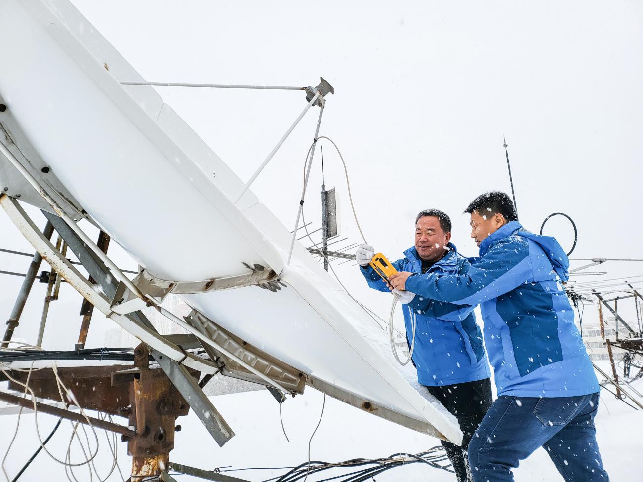 当时,由于积雪层层堆积,卫星天线平均积雪厚度超过了50cm,天线馈口已经开始结冰,为避免“雪衰”威胁信号传输安全,天线除雪迫在眉睫。可由于雪化成冰,天线上既有雪还有冰碴子,清除冰雪难度可想而知。运维部经理朱广宇和副经理付颜军二话不说便带头冲出了门外,与相关技术人员一起攀爬被冰雪掩埋的外挂楼梯,在阜新市分公司办公楼顶上和满天飞雪中徒手作业,历时约两个多小时,才将6个近3米高的卫星天线上的冰雪清除干净。