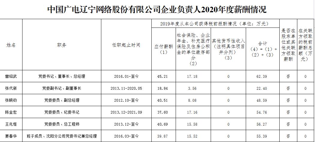 根据辽宁省文资办核准的北方广电网络公司负责人薪酬及企业负责人薪酬信息公开工作的相关要求,现将公司负责人2019年度薪酬情况披露如下
