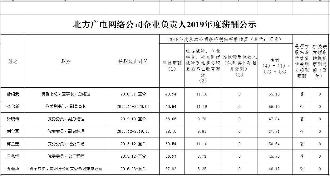 北方广电网络公司企业负责人2019年度薪酬公示