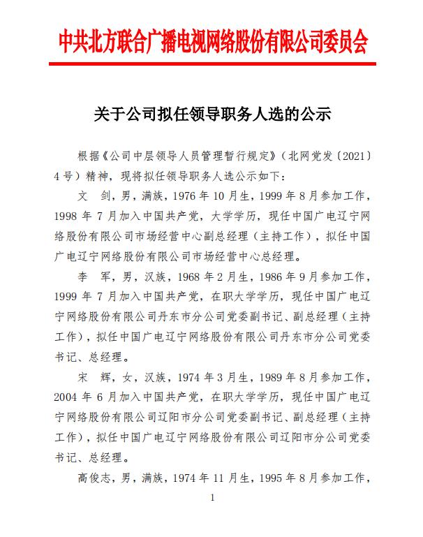 根据《公司中层领导人员管理暂行规定》(北网党发〔2021〕4 号)精神,现将拟任领导职务人选公示如下: