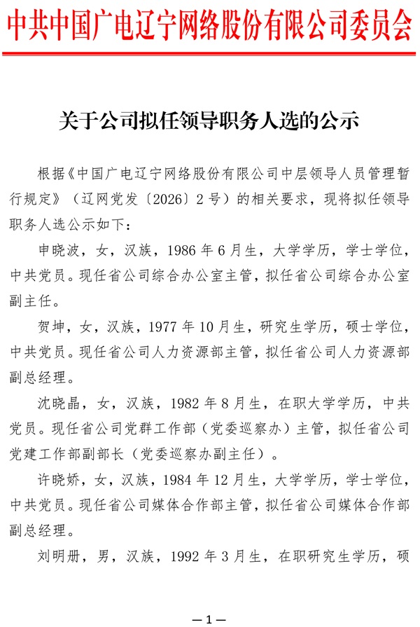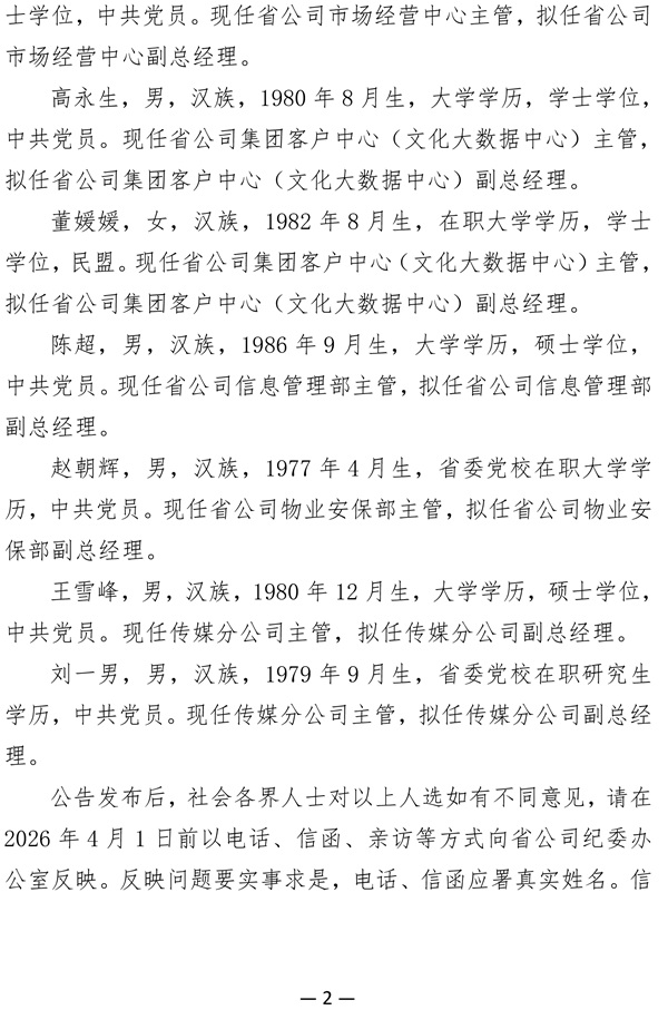 关于公司拟任领导职务人选的公示