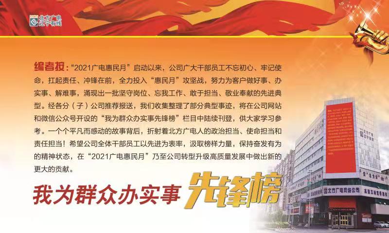 城建南郡业主赵先生,有线电视和宽带即将到期,杨婷婷在打电话提醒赵先生缴费时了解到,赵先生和爱人每天一早就出门直到晚上9点才能回家,两人根本没有时间到营业厅办理续费。为了不影响他的孩子线上学习,征求赵先生同意后,杨婷婷在电视到期前一天自己先垫付为赵先生续费,第二天又起大早赶在赵先生上班前把发票送到赵先生家中。看到杨婷婷全心全意为用户着想,赵先生说:“就冲着这么勤劳周到的营业员,我也会一直使用北方广电的宽带!”